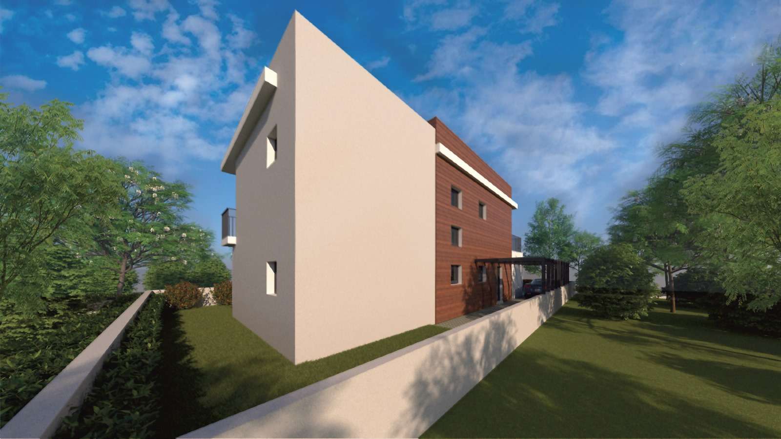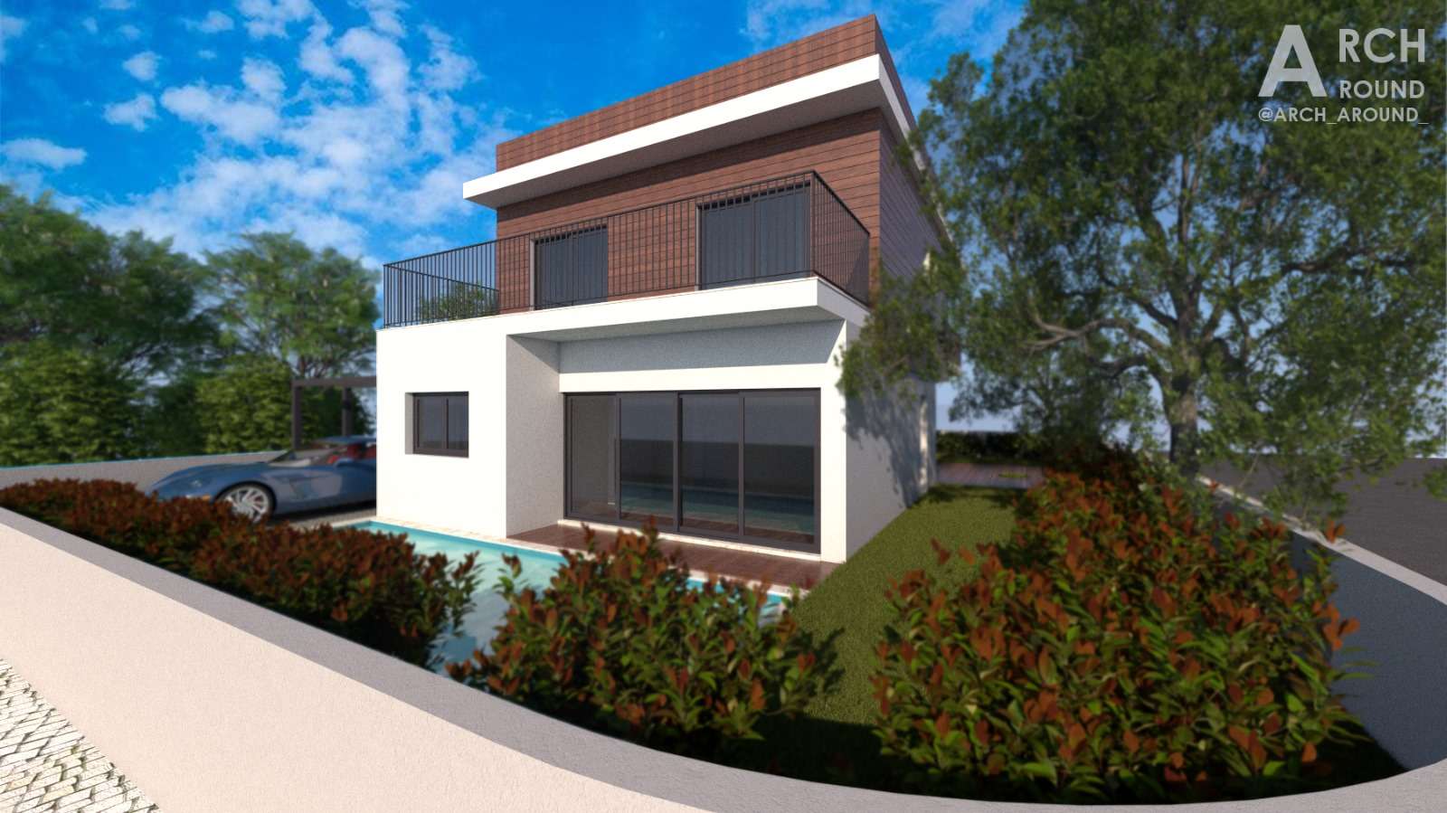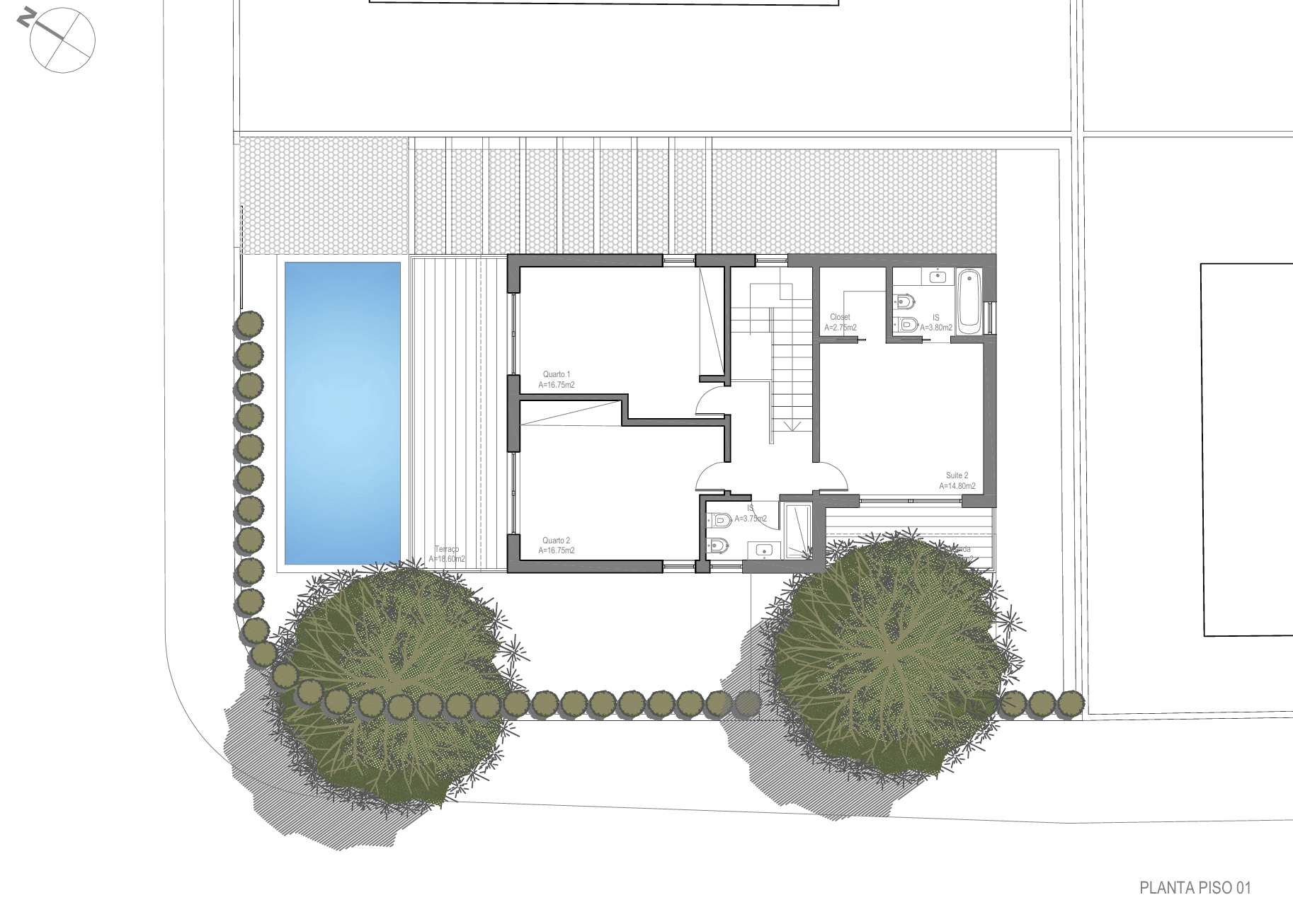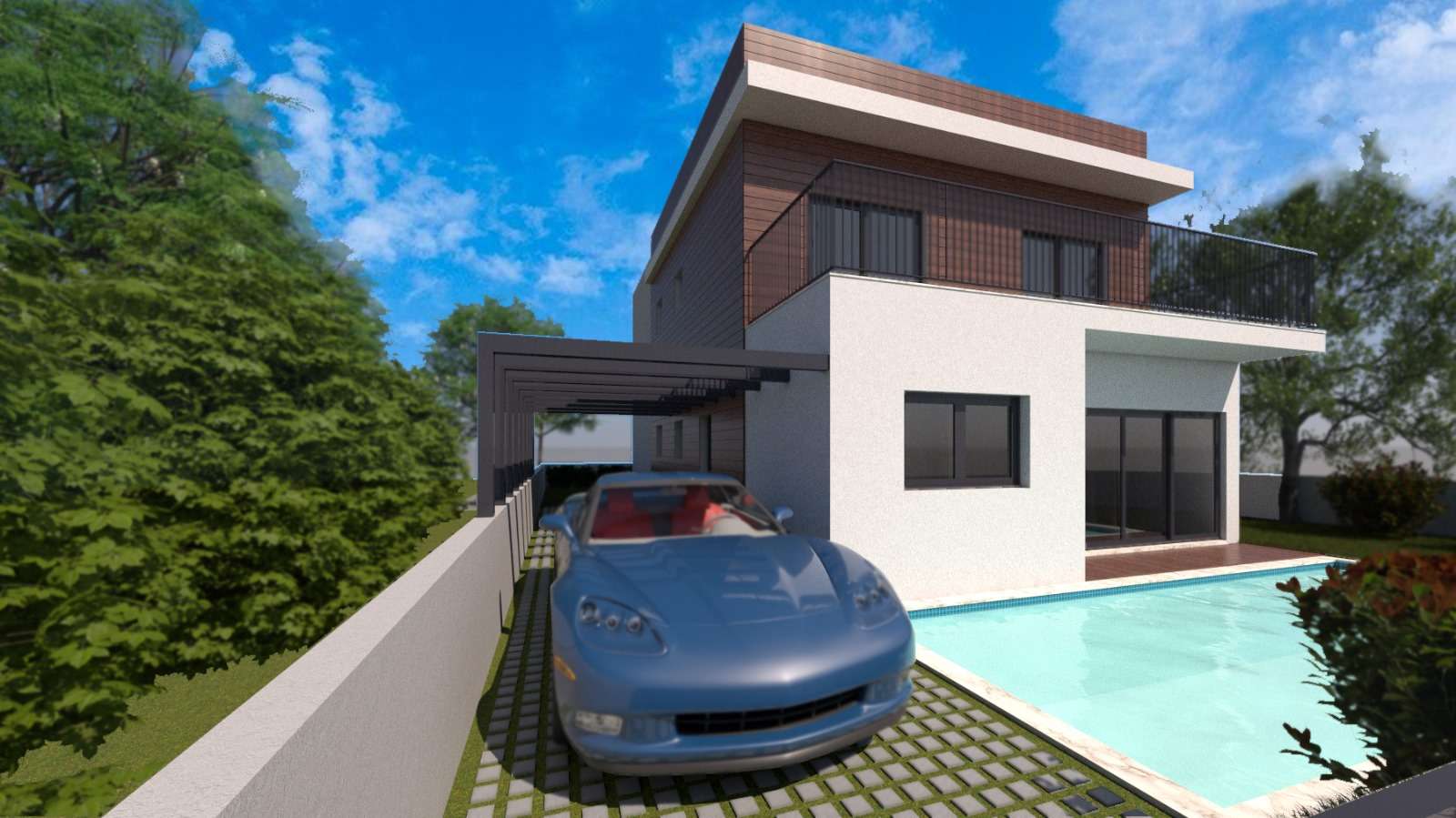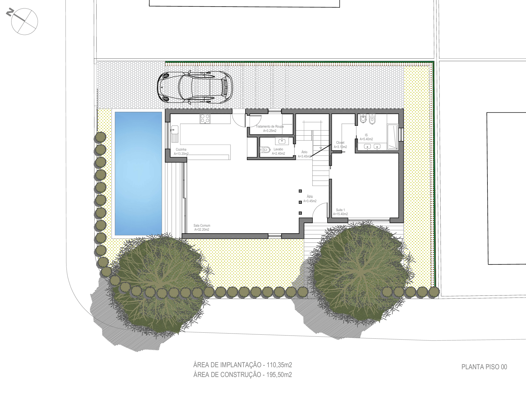 O estudo prévio foi realizado para moradia T4 com piscina, com área de implantação de 110,35 m2 e de construção de 195,50 m2 (de acordo com as imagens apresentadas).